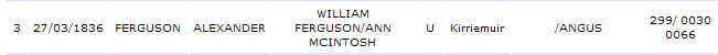 2. Alexander FERGUSON was born on 27 Mar 1836 in Denhead, Kirriemuir, Forfarshire, Scotland and died young.