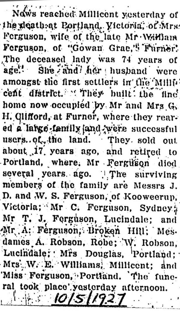 + 10 i. Georgina Dawson FERGUSON was born on 23 Aug 1871 in Belalie, S.A. and died on 10 Jun 1927 in Inman Valley, S.A., at age 55.