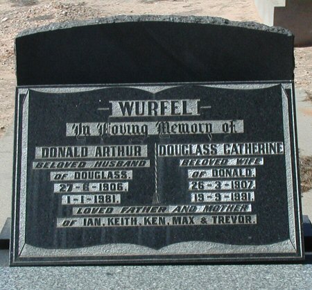 General Notes: Born at Brim, a small community North of Waracknabeal Vic. Donald Arthur Wurfel was born on 27th June 1906 at "Willowbank," the old Brim (Victoria) station homestead, and was the third child of Henry and Agnes Wurfel. He was educated at Brim State School, the Longerenong Agricultural College, and the Dookie Agricultural College. In 1926 the "Border View" property at Pinnaroo was purchased and on 23rd September 1931, he was married to Douglass Catherine Ferguson, the elder daughter of pioneers James and Ada Ferguson of Pinnaroo. Mr Wurfel was a committeeman, president, honorary life member, and patron of the Pinnaroo Agricultural Society. He was an outstanding exhibitor during the whole of his life at Pinnaroo, being particularly notable in connection with the Grain and Farm Produce and Draught Horse stock sections. His collections of cereals were a feature of the Show and most instructive, and his beautiful horses were greatly admired. He was a most generous donor in work, skill, and finance to innumerable Show projects and to local community institutions. As honorary secretary of the Parilla Well Agricultural Bureau from 1948 until his death, he organised a host of valuable activities including lectures, field days, hogget competitions, conferences, film evenings, shearing schools for young shearers and wool classing schools (the latter two activities in his own shearing shed). For many years he conducted private wheat variety and superphosphate trials which were of great value to local farmers and the industry in general. His persistent advocacy of the wheat varieties Insignia, Heron, and Halberd, which were productive, profitable, and suited to local conditions, did much to further their acceptance despite opposition from some quarters. The immense margin in profitability of these wheats over any other recommended variety of their day, confirmed the wisdom of his counsel. His knowledge of cereals, and particularly of wheat, was prodigious. He assembled what was acknowledged as one of the most comprehensive and remarkable private collections of cereals in Australia if not the world. Part of this collection is housed at Pinnaroo and part at Warracknabeal. One of Mr Wurfel's main achievements was the establishment of the Pinnaroo Farm Machinery Museum. He encountered an appreciable amount of apathy and some opposition to this project, but persisted with it. A large building which houses a fascinating collection of farm implements, tools, and appliances, many of which would otherwise have been lost, stands as a memorial to his foresight and determination. The Pinnaroo Historical Society was founded with the sole object initially, of establishing the Farm Machinery Museum. Mr Wurfel was secretary of the Society from its foundation until his death.
