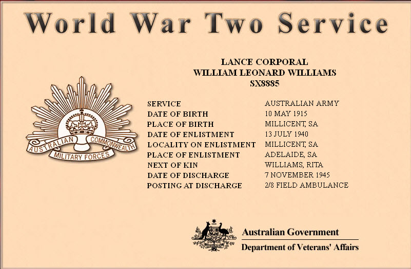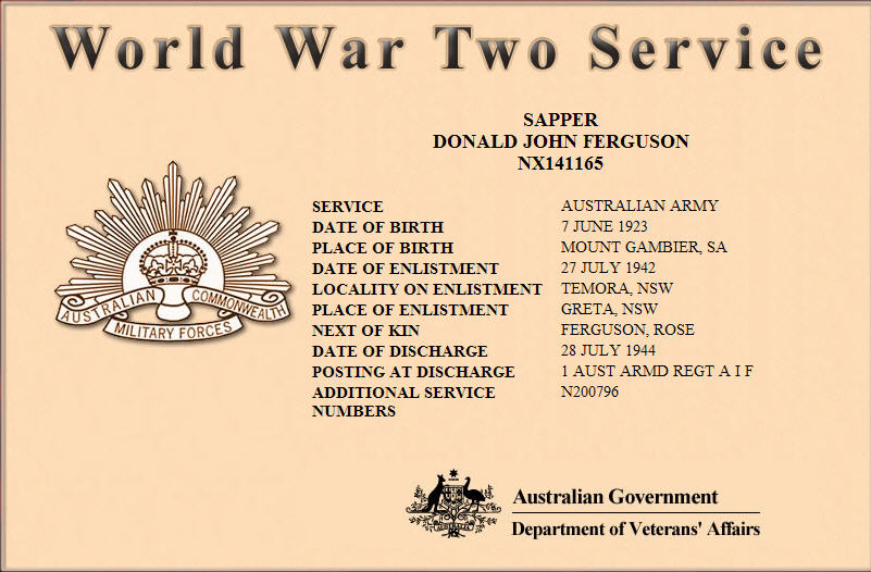 52. William Edwin FERGUSON was born on 15 Jul 1919 in Pinnaroo, S.A. and died on 16 Jan 1942 in WWII, at age 22.